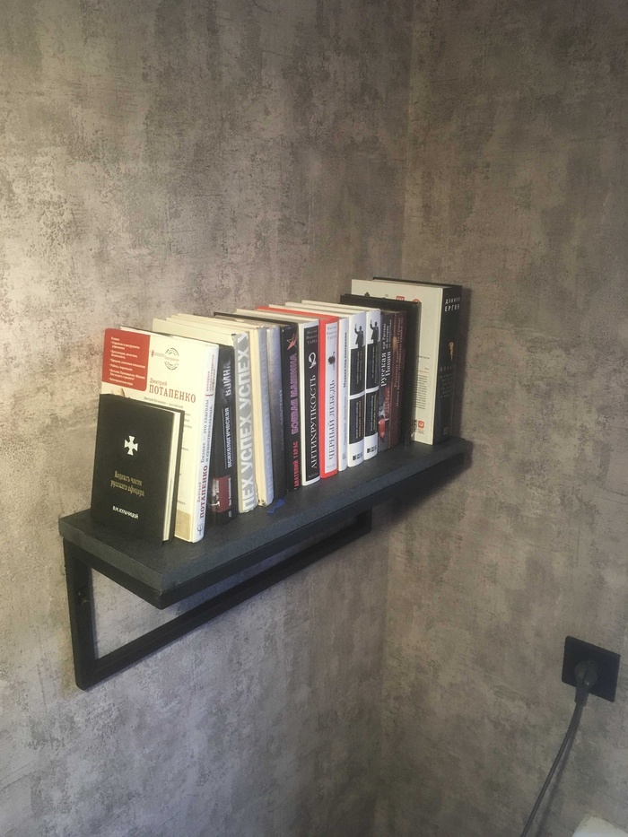 Осенью 20го года, я закрываю офис, чтоб не платить зимой аренду. Все равно не сезон и клиентов нет. Но рабочее место мне надо, поэтому в доме сделал себе кабинет. Нужна была полка для книг, а в сохраненках фото, был как раз пример полки лофт. Решил так же как и с предыдущим столом, сделать каркас из металла, а верхнюю часть - гранит, но на этот раз черный, только не до конца отполированный, чтоб он был более матовый и светлый, в тон обоев.