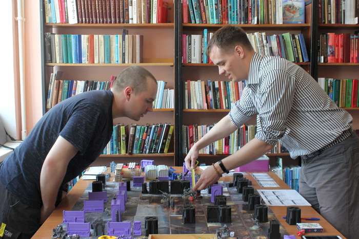 Повернув налево мы попадаем на настоящее поле боя, отряды космодесантников яростно сражаются с полчищами порождений хаоса. Гремят выстрелы, грохочут взрывы и надежда только на верную плазменную винтовку и крепкую силовую броню. Здесь играют в варгеймы. Клуб «Реролл» предлагал всем желающим погрузится в мир Warhammer 40,000 и попробовать себя в роли космического полководца или лорда хаоса.