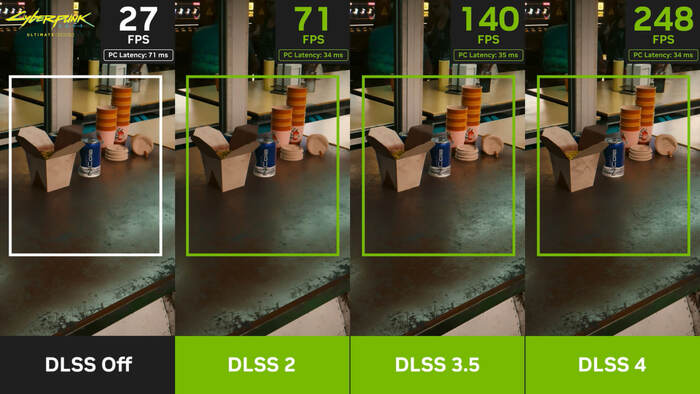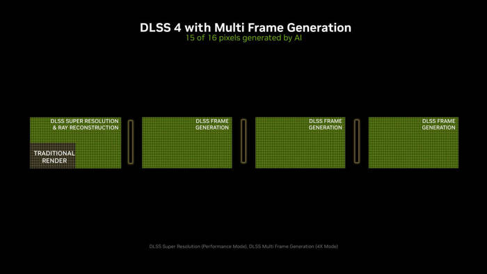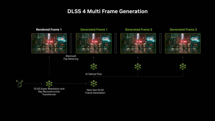 В DLSS 3 генератор кадров FG «рисовал» два кадра, а затем с помощью ИИ интерполировал промежуточный. Из-за этого игорёк наблюдал небольшую задержку и иногда некоторую нестабильность. DLSS 4 работает иначе, вместо интерполирования двух или трех кадров система буквально «предсказывает будущее», а не «интерполирует прошлое», утверждает господин Дженсен Хуанг aka Куртка.