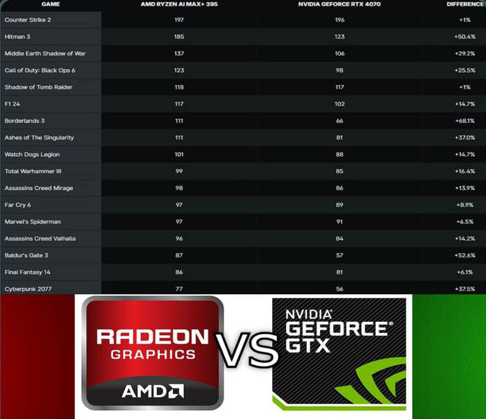 ️Ryzen AI Max+ 395 продемонстрировал более высокую производительность, чем RTX 4070M, согласно тестам от AMD.