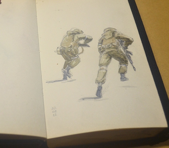 Наш Z штурмовик из блокнота в контексте наброска женской фигуры среднего формата (Акварель, Карандаш, Темпера, Блокнот, Цветные карандаши, Офисная бумага).