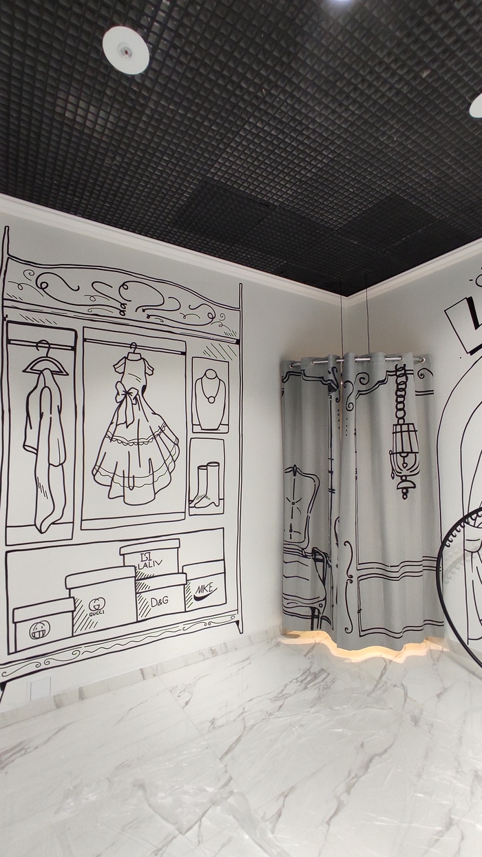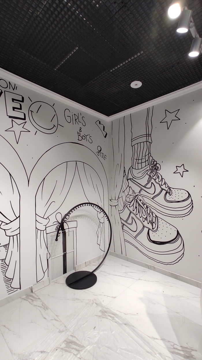 С заказчицей обсуждения происходили дистанционно из-за того, что она была постоянно занята, а потом вообще улетела на отдых. И вот вроде бы я ей показал все эскизы и вроде всё рассказал, но видимо произошло недопонимание и часть с арками после нанесения рисунка ей не понравилась. Я сказал, что окей, я переделаю, не вопрос, пусть ваши маляры закрасят, а я нарисую по-новой. Она согласилась, передала инфу малярам.