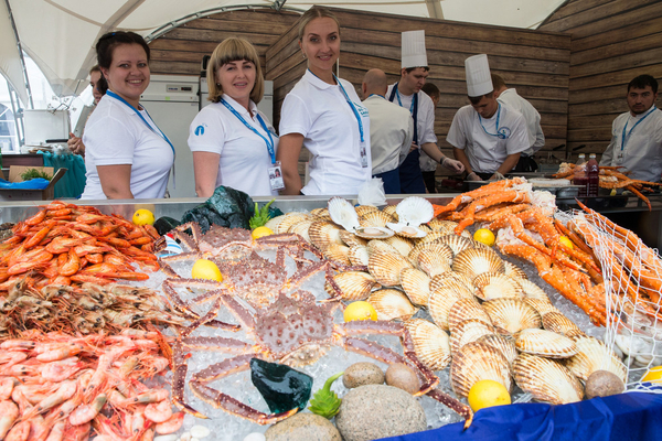 Также, наибольшее внимание посетителей «Рыбного рынка» привлек и островной стенд, где были широко представлены дары моря: крабы, устрицы, креветки, гребешок, трубач, икра в деревянных бочонках.
