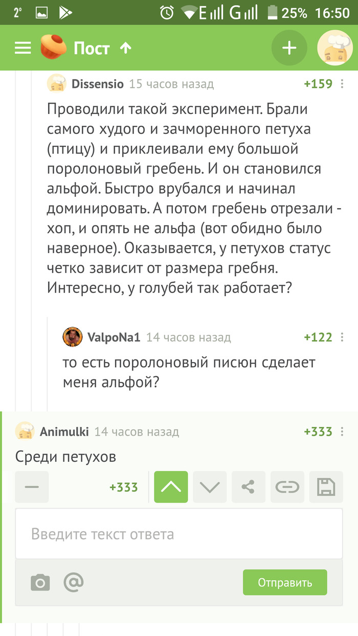 Эксперименты с куриной психологией показывают, что крупный накладной гребешок мгновенно повышает статус неуспешной особи. Сородичи сразу меняют к нему отношение: курочки начинают поглядывать заинтересованно, а петухи даже не решаются вступать с ним в конфликт.