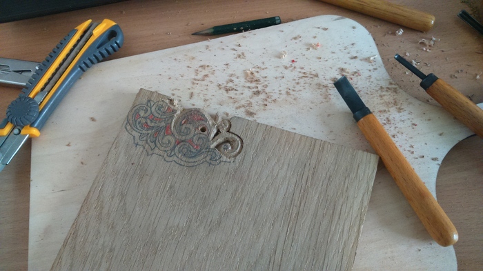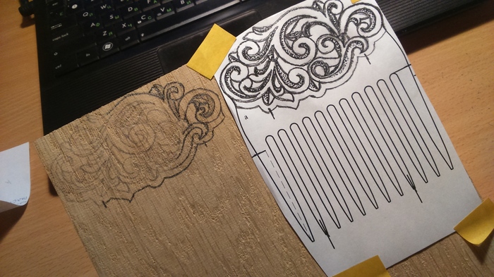 Следующий этап, после создания эскиза, это его перенос непосредственно на заготовку. Самый популярный способ – копирка. Но тут мой внутренний еврейчик стал грозно грозить кулаком (160р пачка копирки!) и твердил мне: придумай что-нибудь, тыжинженер. И я придумал: вооружился самым мягким карандашом из своего арсенала, с обратной стороны листа черкал им до посинения (несколько слоев) и получил своеобразную копирку – красящий слой с одной стороны и рисунок с другой. Аккуратно прикладываем лист черкашом к дереву (хехе), фиксируем скотчем, ведем карандашом по узору, убираем лист и – вуаля - получаем еле четкий, но все же приемлемый для дальнейшей работы эскиз. Утолщаем линии для лучшей визуализации, и, пожалуй, можно приступать к резке