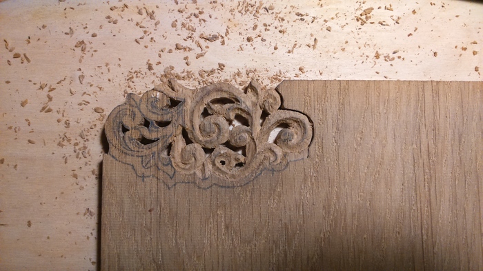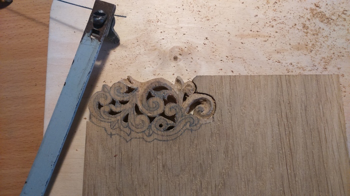 Начал именно с орнамента, так как боялся запартачить его, плюс кое какие навыки выпиливания лобзиком имелись. Этим же обусловлено расположение картинки в углу ламели: в случае провала можно сдвинуться в сторону и начать заново. Несколько фоточек в процессе