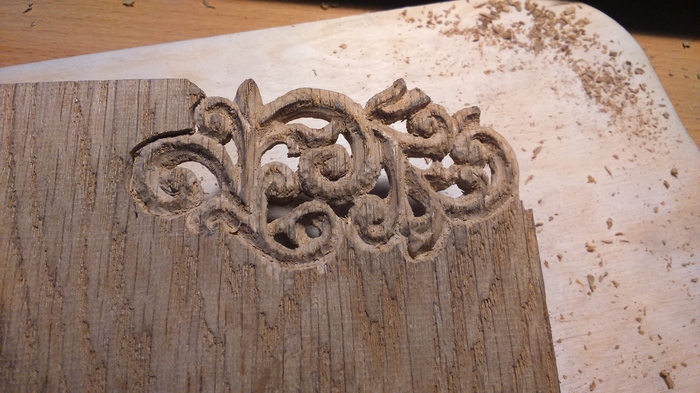 Тем не менее, медленно, но верно дело двигалось с мертвой точки. Приобретал необходимые компоненты: заказал дубовые ламели, на следующий годик прикупил резцы, а еще через годик решился с узором. Все это отнимало крайне много времени, так как я тот еще зануда и очень щепетильно отношусь к каждому нюансу, что заметно тормозит работу. Сначала много читал про древесину, каким-то чудом остановился на дубе. Потом также долго искал более менее подходящие резцы, чтобы и качество не хромало и цена не кусалась. Выбор пал на старый советский набор, который откопал где-то в глубинках автио. Но все же самое тяжелое из всего – выбор подходящего узора. Уровень сложности (все таки первая работа), возможность вырезать из имеющейся заготовки, и конечно-же, изящность и красота орнамента должны были в полной мере гармонировать друг с другом. Первые эскизы появлялись чаще, чем приобретались необходимые для работы составляющие. Долго ли, коротко ли, но все же путь поисков был завершен. Выбранный узор был загнан в программку копмас-3д, где с успехом отмасштабировался и приобрел зубчики.