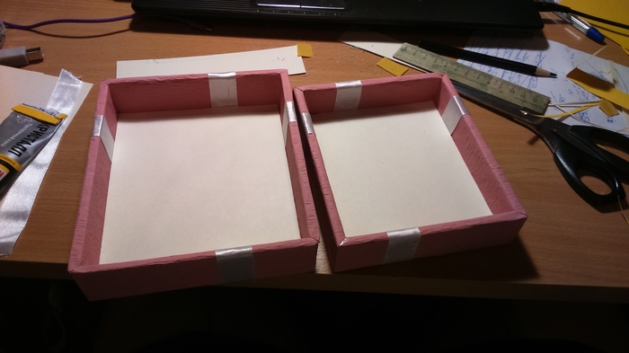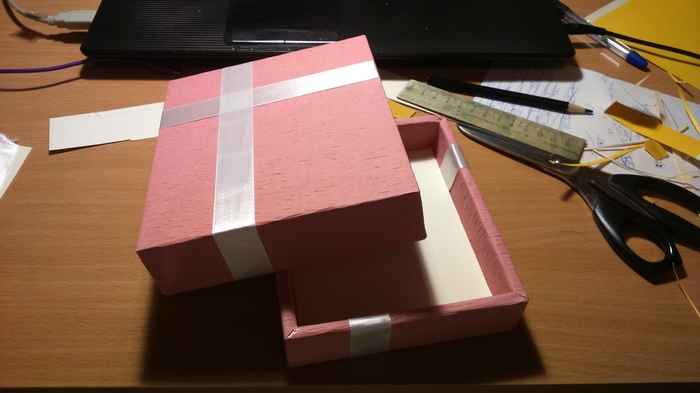 Тут меня снова накрыло. Никогда бы не подумал, что на выбор цвета коробки потрачу минут 30 в магазине, при том ассортимент не особо большой. Замучив продавца ожиданием, приобрел таки бумагу, ленточку и по возвращении в общажку закончил коробку.