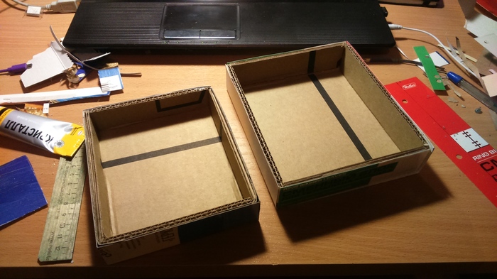Настало время упаковки. Решил изготовить ее самостоятельно. Так можно и размеры необходимые обеспечить, и прочность, и внешний вид. Вообще, вопрос подачи довольно спорный. С одной стороны, зачем уделять ей внимание, когда важна конфетка, а не обертка, но, с другой стороны, презент должен выглядеть законченным, подан правильно. Оставив в покое философию, я принялся кромсать подаренный товарищем картон. Нарезал по заранее намеченным линиям, согнул и склеил. Основание, крышка.
