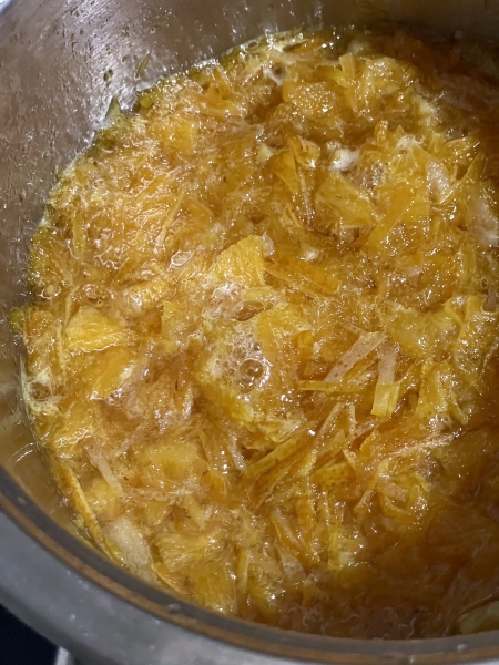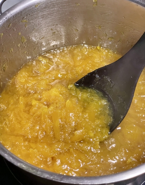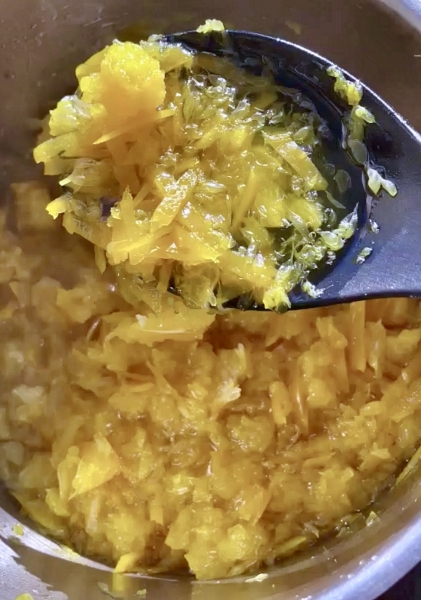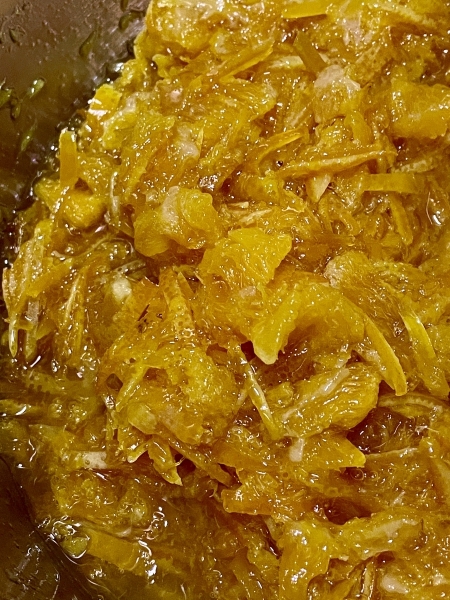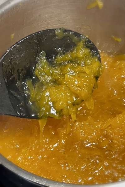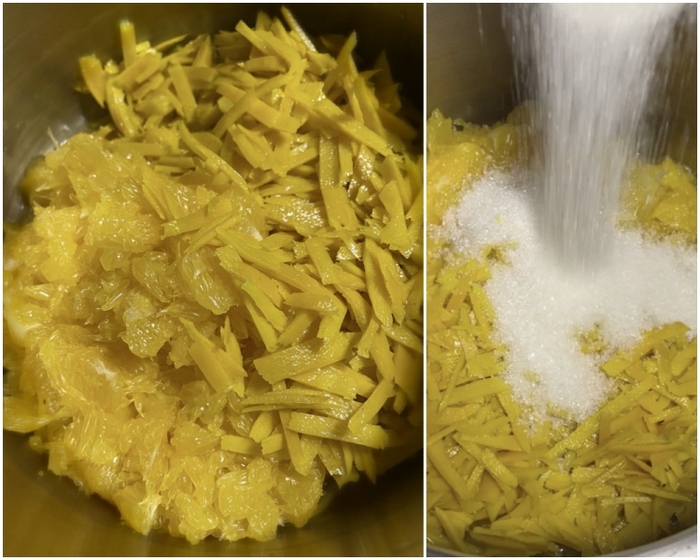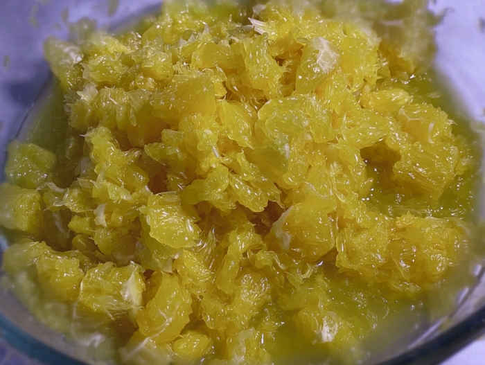 В идеале нужно получить не какую-то кашу бесформенную, а именно перемешанные фрагменты мякоти и цедры. Понятно, что часть мякоти разварится, но…!