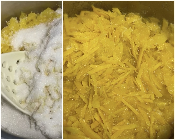 Про цедру. Залить кипятком. Крутым. И пусть минут 15-20 стоит запаривается. Цель этого действа – добиться, чтобы горечь пропала и флаведо (цветная часть кожуры) стала мягче.