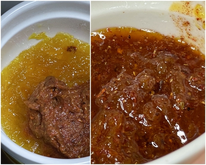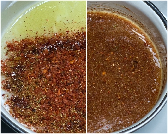 У меня есть сухая аджика. И паприка … скорее дроблёная, чем молотая. Вот и взял я столовую ложку паприки, чуть больше аджики и смешал всё это с растопленным маслом. Очень хорошо перемешал, тщательно.