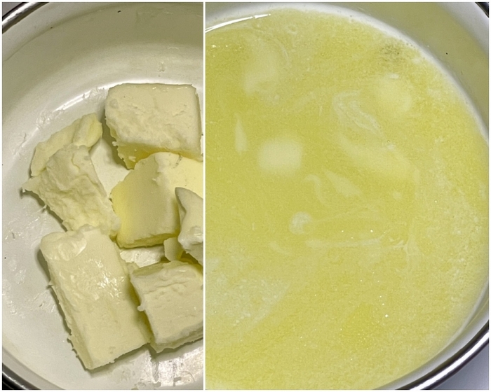 Двадцать граммов сливочного масла растопил, вернее сказать, разжижил. Потому что не нагревал особо, просто довел масло до почти жидкого состояния.