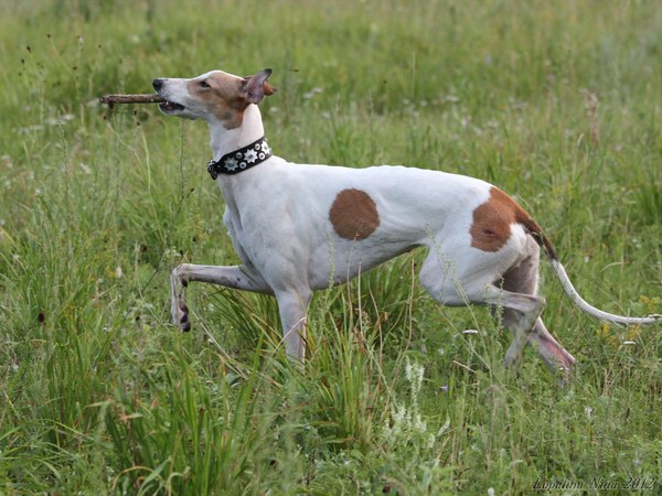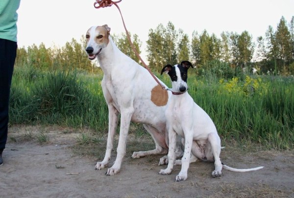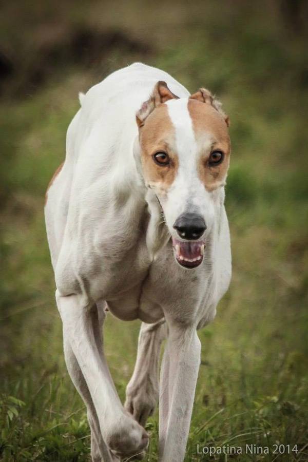 Estet Classic Snow Fairy Southpoint (Эстония), белого окраса. Белые собаки должны иметь хорошо пигментированные нос, губы и обводку глаз. Поскольку у грейхаунда нет подшерстка, пигментация кожи может просвечивать сквозь шерсть в виде своеобразного крапа.