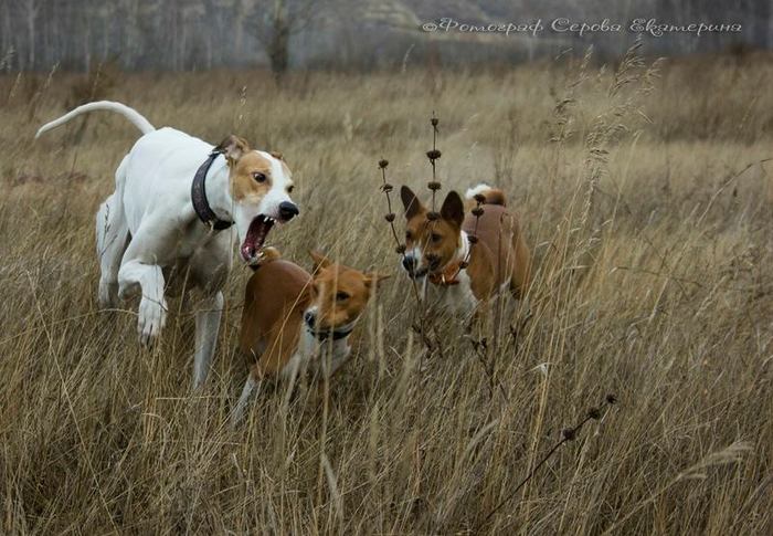 Фрагмент с чемпионата по курсингу за живым зайцем. Намордники не позволяют собакам схватить зайца или причинить ему вред, а специальное ограждение дает возможность скрыться от собак. В отличие от более привычных бегов за механическим зайцем, такие соревнования проходят на открытой площадке и всегда среди двух собак (за механическим зайцем может бежать более двух собак одновременно).