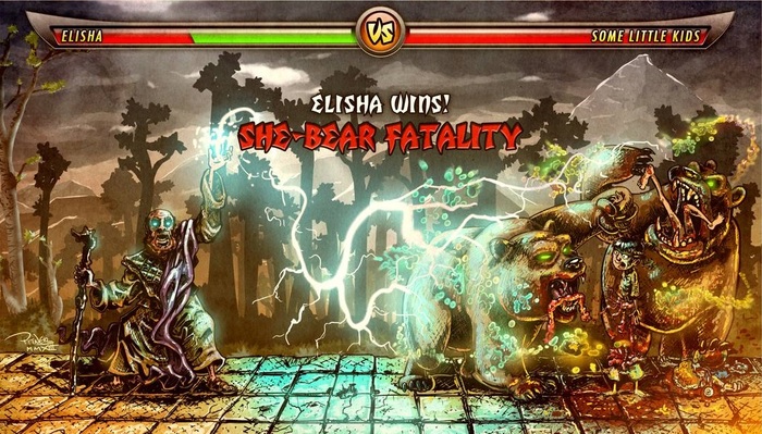 Когда он шел дорогою, малые дети вышли из города и насмехались над ним и говорили ему: иди, плешивый! иди, плешивый! Он оглянулся и увидел их и проклял их именем Господним. И вышли две медведицы из леса и растерзали из них сорок два ребенка. (4-я Царств 2:23-24)