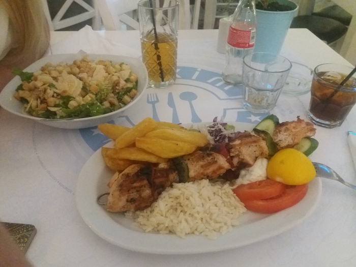 Еда на острове довольно пресная, но к этому быстро привыкаешь. Я как человек который дважды посолит и поперчит, а еще заправит все каким ни будь соусом, был сначала не доволен данным фактом, но потом быстро привык и наслаждался насыщенным вкусом еды, приготовленной исключительно из свежих продуктов. Соль и перец мне заменяло потрясающее по вкусу оливковое масло, бутыльки с которым стояли на каждом столе в каждом кафе и использовались всеми и практически для всего :)
