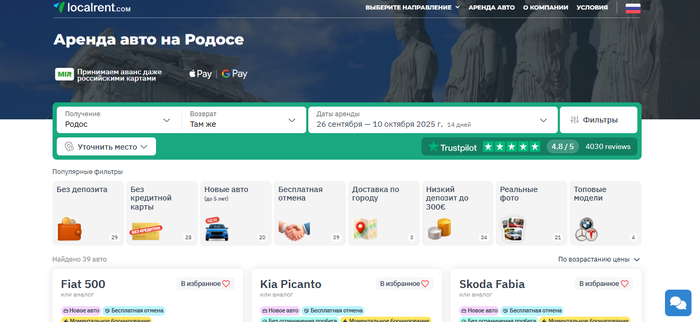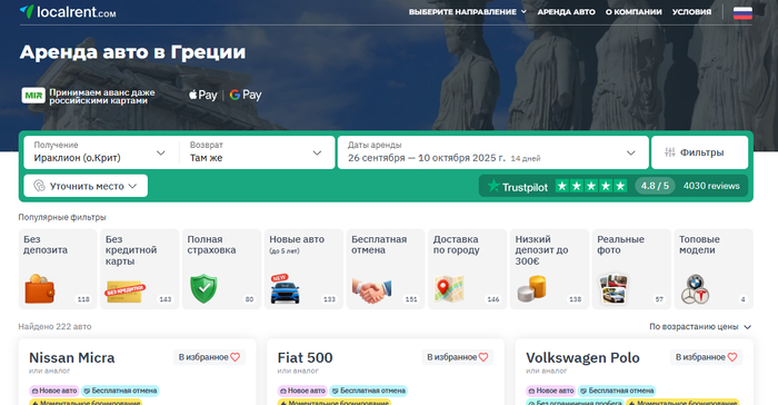 Localrent объединяет местные прокатные компании и даёт то, чего часто не хватает международным агрегаторам: реальные фото конкретной машины, понятные тарифы и живую поддержку. Когда я бронирую у них машину на Крите или Родосе, мне не приходится гадать, что за «или аналог» приедет. На фото — тот самый авто, а не портрет «идеала».