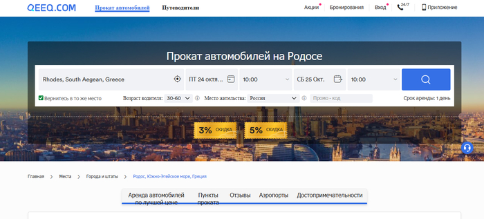 Qeeq я обычно рекомендую тем, кто хочет получить авто прямо у аэропорта и быстро выехать: платформа любит аэропортные точки, а акции здесь появляются регулярно. В сезоне можно ловить промокоды, а вне сезона — симпатичные цены на компактные «автоматы» для городских путешествий по Афинам и Салоникам.