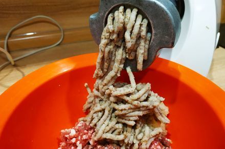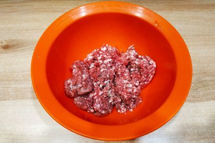 3. Подготовьте свино-говяжий фарш. Можете прокрутить мясо через мясорубку, а можете использовать готовый из магазина. У меня был готовый домашний фарш.