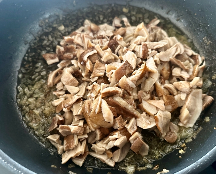 Туда же отправляем и все уже нарезанные шампиньоны, даем им дать сок, начать выпариваться и ужаривается, примерно 6-7 минут, продолжаем мешать: