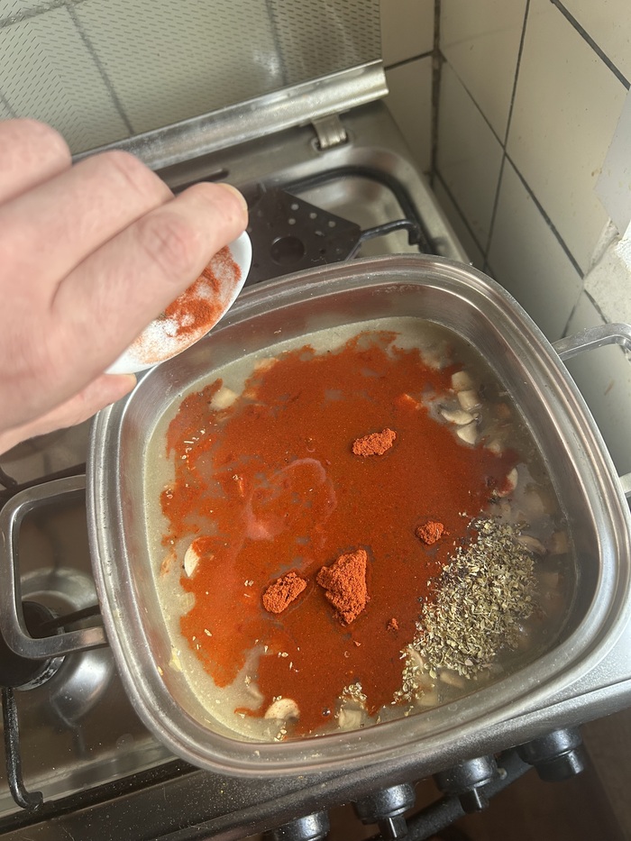 Заливаем наш подготовленный бульон, добавляем обычную паприку, перец и орегано, копченую паприку оставляем пока не тронутой, размешиваем, дожидаемся закипания, накрываем крышкой и оставляем на 15 минут на минимальном огне: