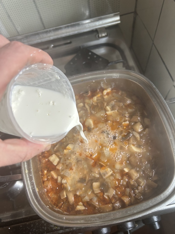 Когда время подходит, смешиваем крахмал и сливки в отдельной емкости, стараемся максимально избавиться от комочков, вливаем получившуюся жижу в суп, доводим до кипения и снова на минимальном газе держим 10 минут под крышкой: