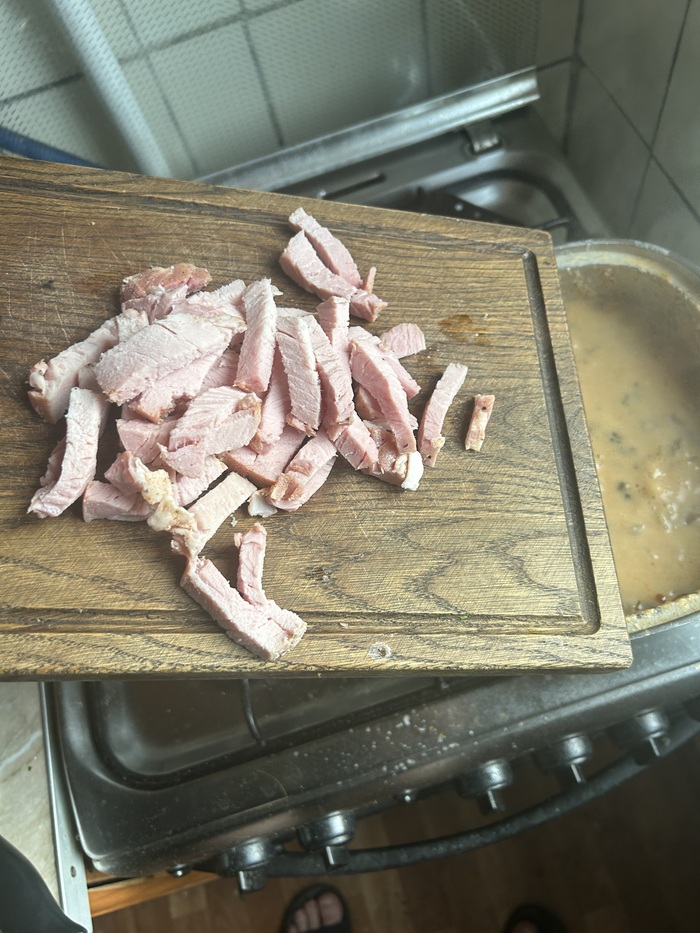 Свиной варенный фабрикат - 300-400гр.: у меня была домашняя "су-вид свиная шея", рецепт тут: Мини-рецепт свиная шея в sous-vide но использовать можно что угодно: окорок, грудинка, ветчина.