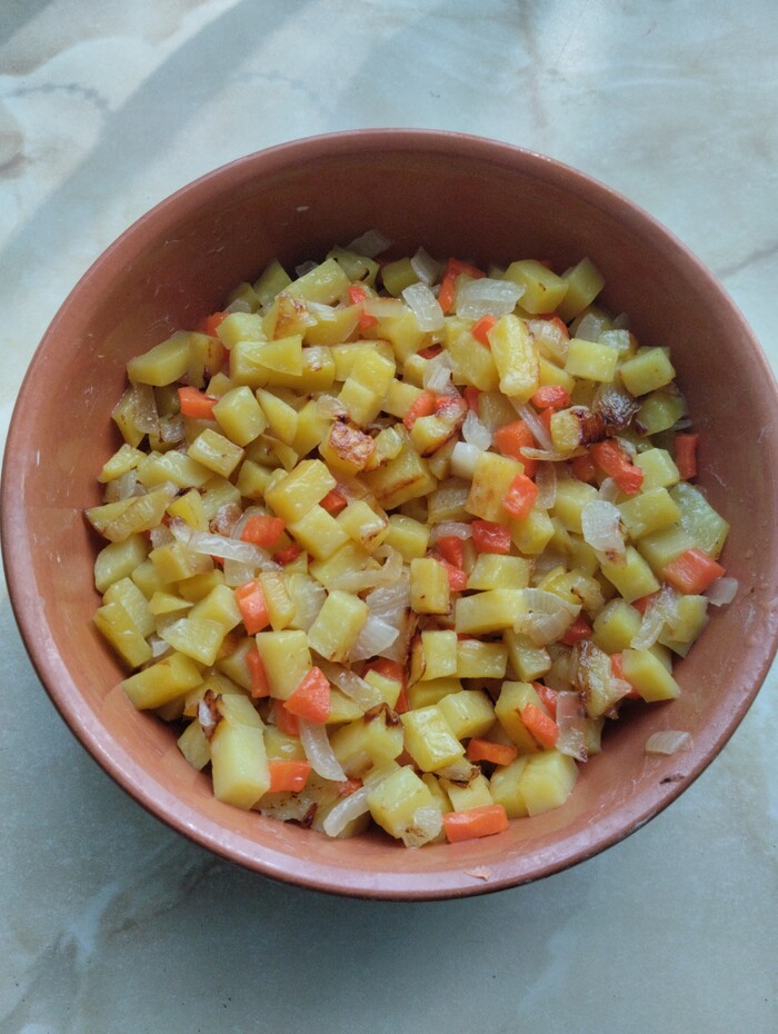 Потом из кастрюли их вынул, а три картофелины (нарезав их мелким кубиком) наоборот в кастрюлю отправил.