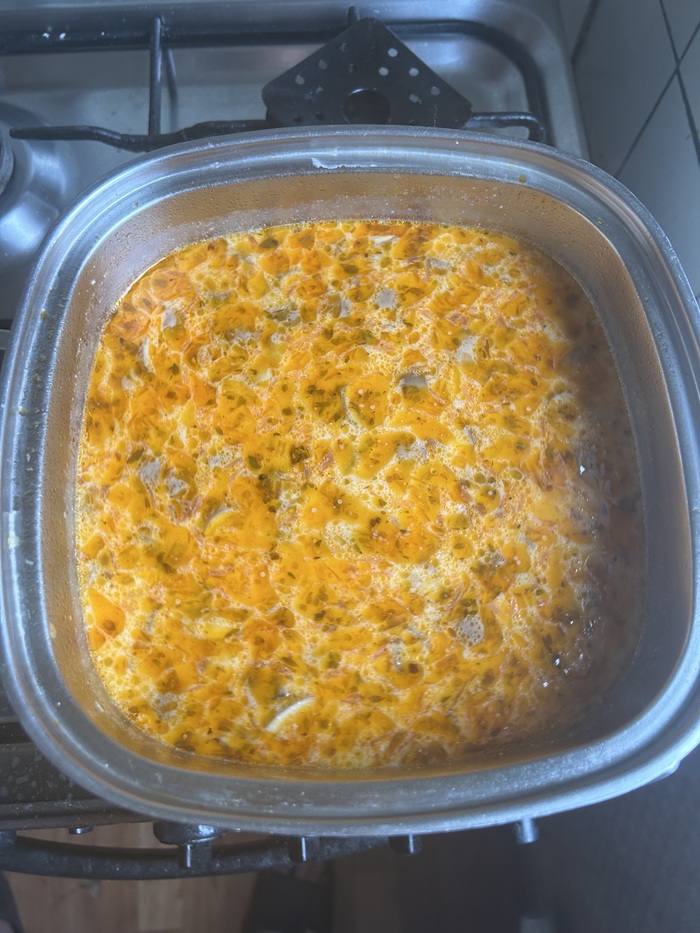 Бульон - 1.5 литра: в идеале домашний, наваристый куриный, у меня был замороженный с прошлых готовок, можно заменит водой, можно водой с бульонным кубиком, финальный результат пострадает, но не сильно.