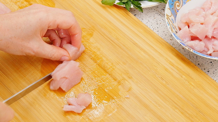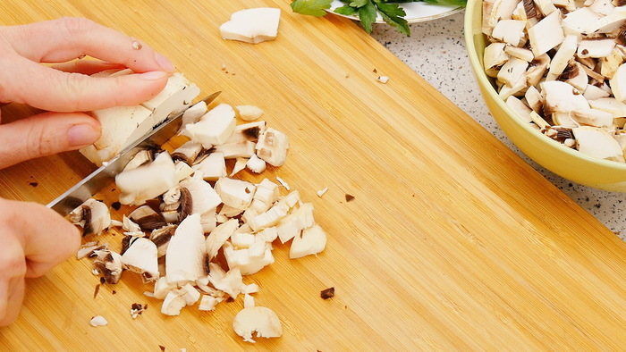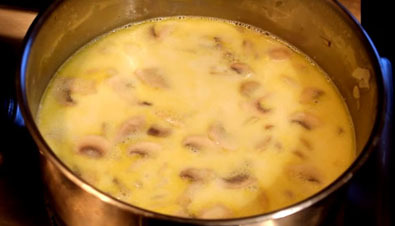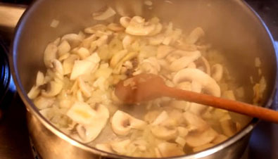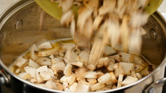 Теперь добавим грибы шампиньоны. Мы не зря берем именно эти, довольно распространенные, грибы. Они обладают очень нежным вкусом и приятным, насыщенным грибным ароматом. При этом безопасны, так как выращены в теплицах. Грибы нужно предварительно тщательно помыть, дать стечь воде и нарезать тонкими пластинами. Подготовленные шампиньоны высыпаем в кастрюлю к луку.