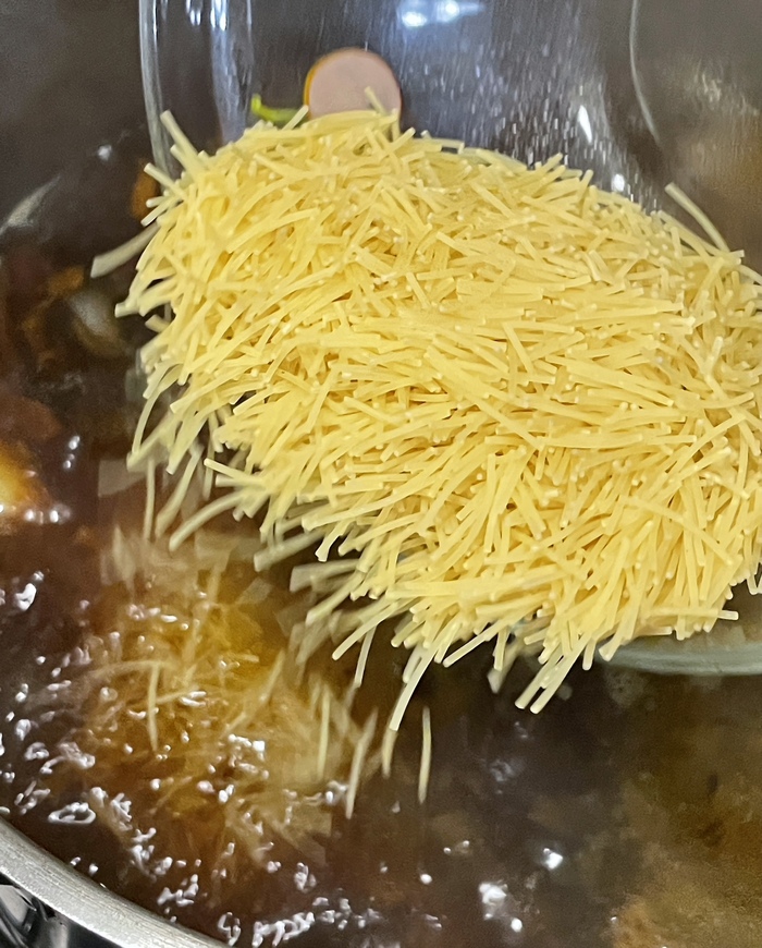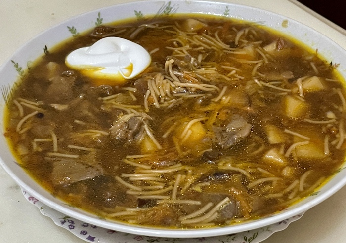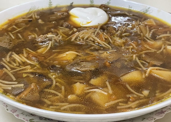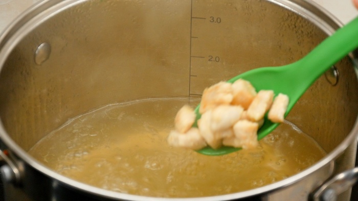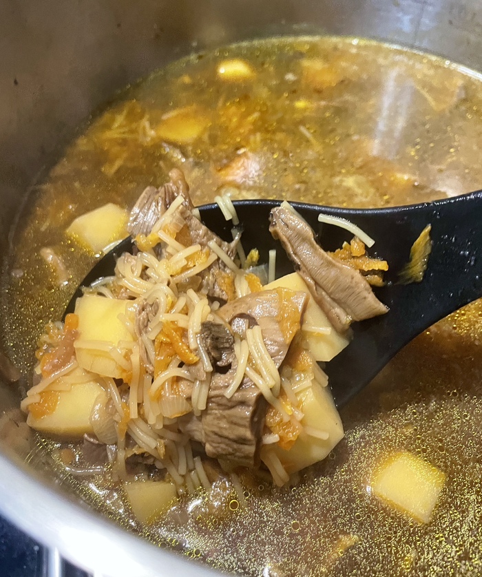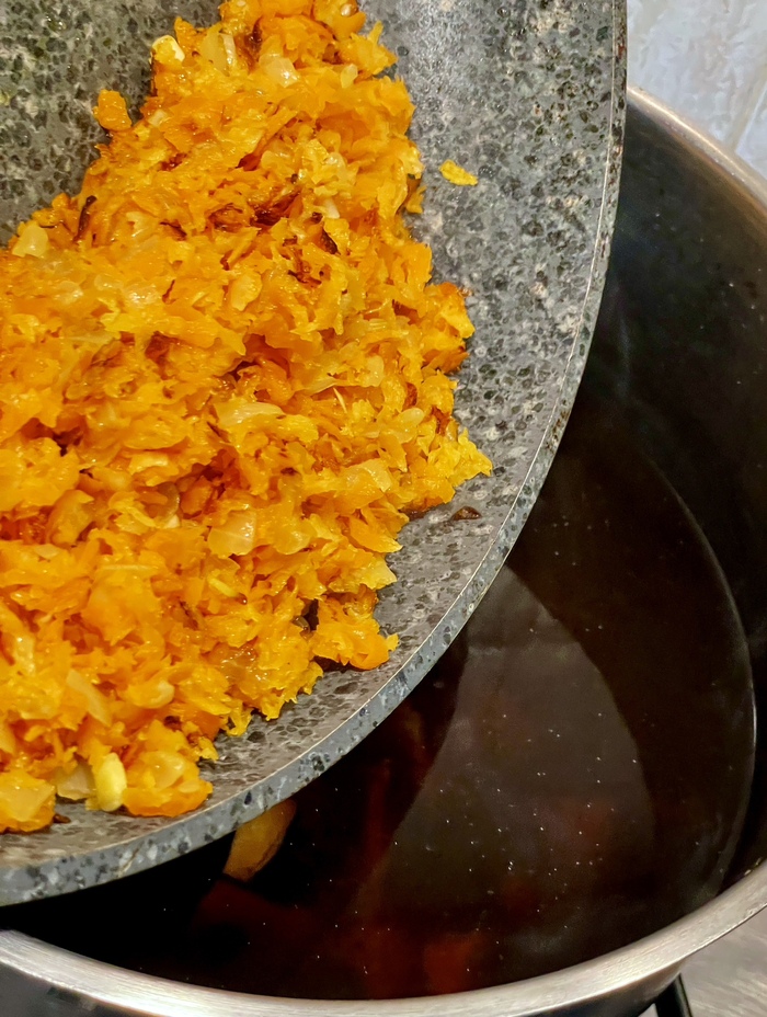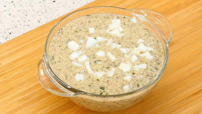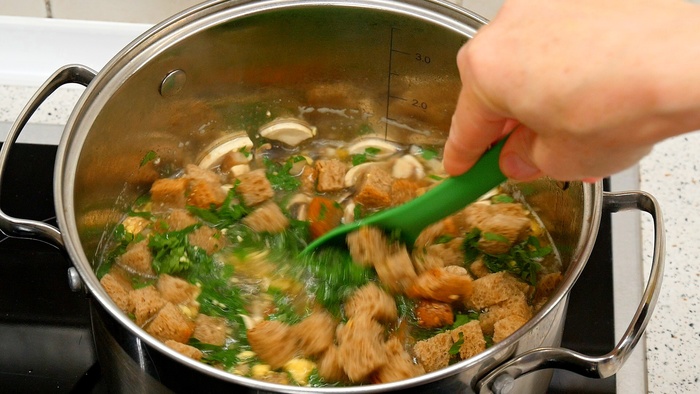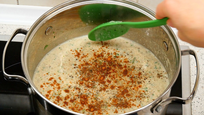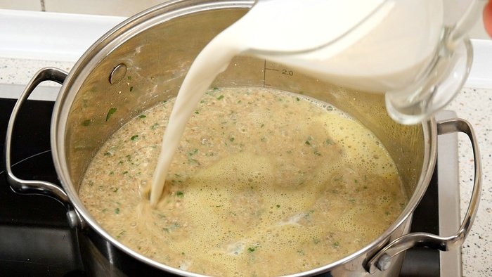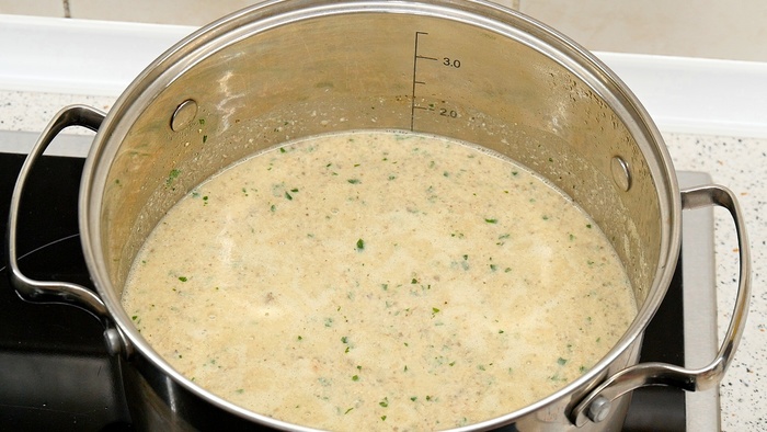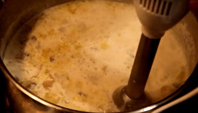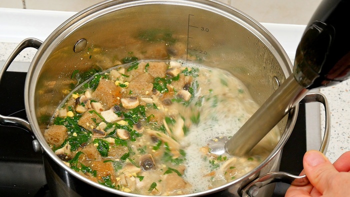 Когда суп сварится, аккуратно опустим в него погружной блендер или миксер и взобьем его до однородной массы. Блендер ставим на низкие обороты, так вы исключите возможные ожоги от горячих брызг. Суп должен получиться без комочков, с нежной, однородной текстурой.