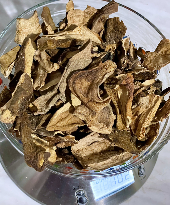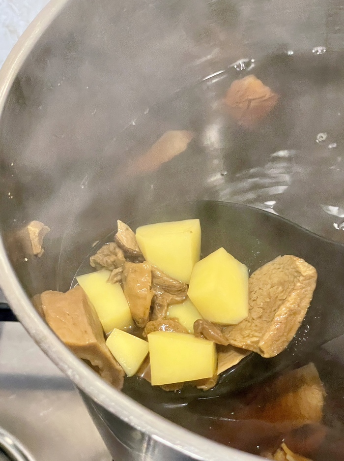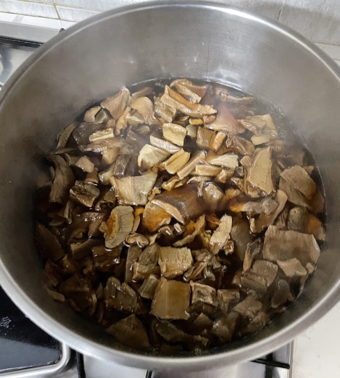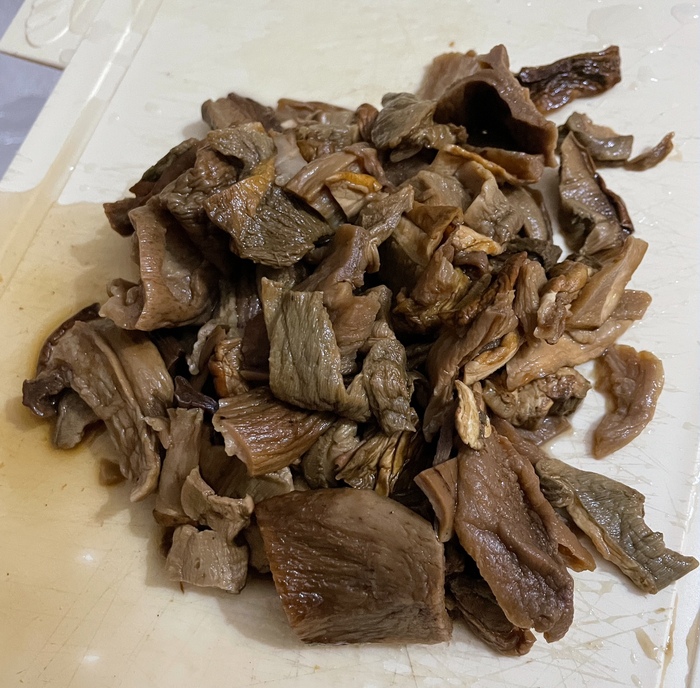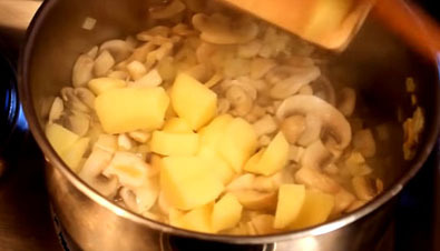 Предварительно очищенный картофель, режем небольшими кусочками и добавляем в кастрюлю к нашим грибам. Перемешаем.