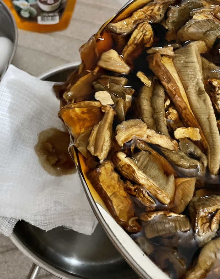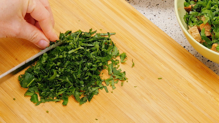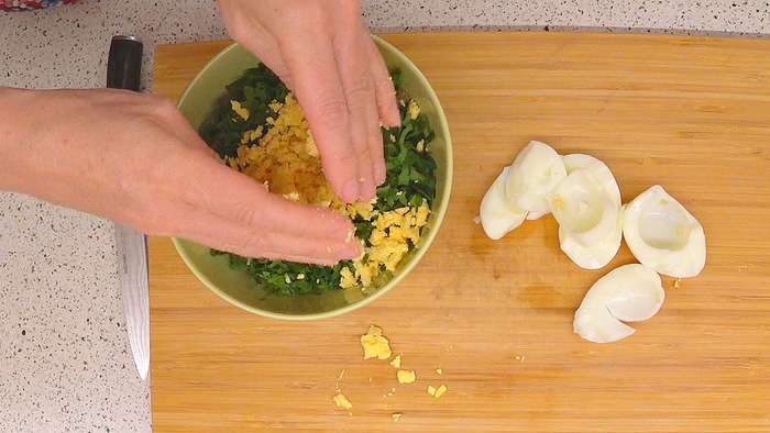 Очистим и крупно порежем чеснок. Добавим к грибам и перемешаем, чтобы они лучше впитали аромат чеснока.