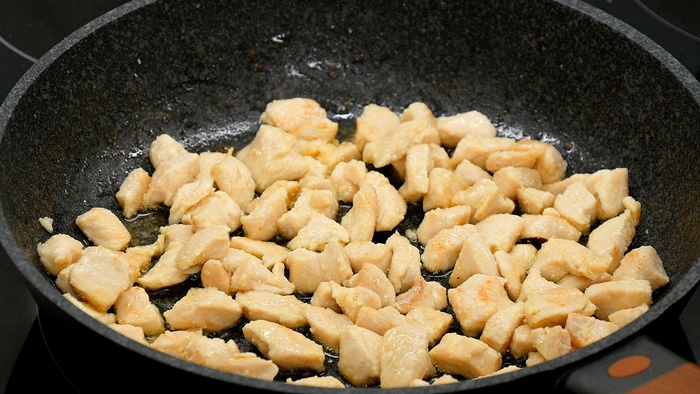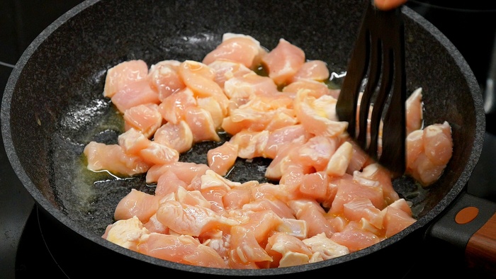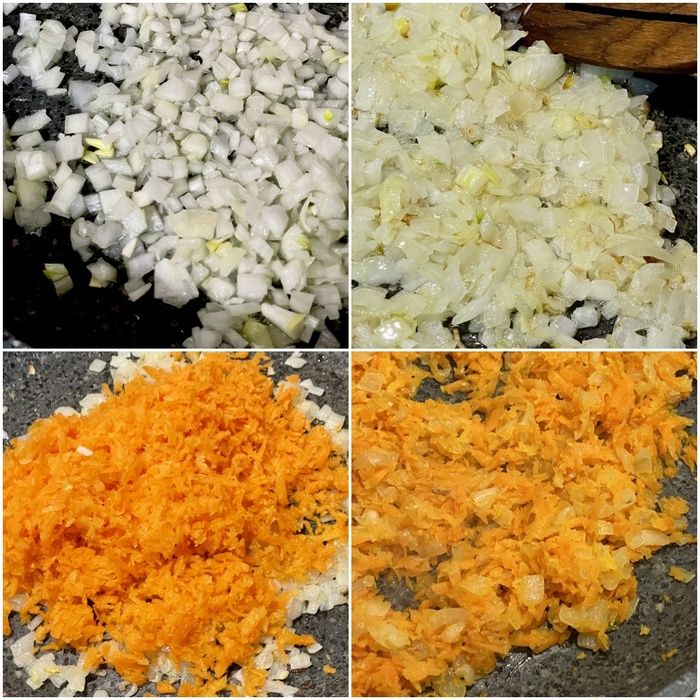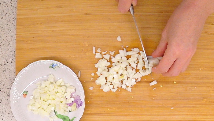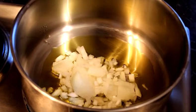 Ставим на маленький огонь кастрюлю и наливаем в нее оливковое масло. Добавляем мелко нарезанный кубиками репчатый лук. Слегка помешиваем.