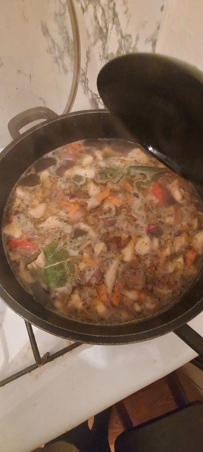 Отправляем обратно в кастрюлю. Следом овощи и грибы. Кокосовое молоко. Специи, соль лавровый лист.