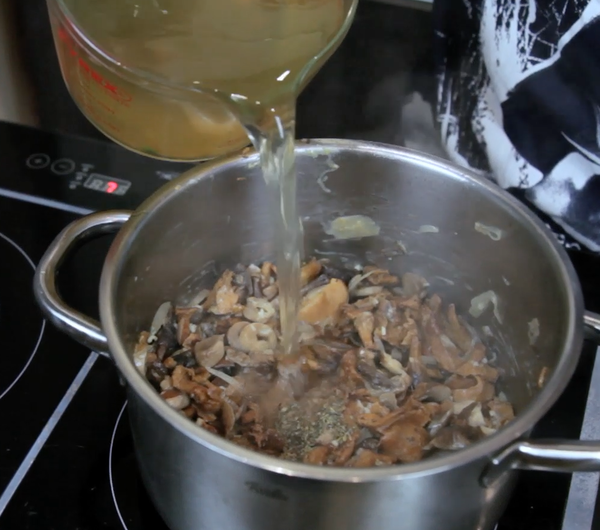 Затем добавить чеснок и горчицу, хорошо перемешать. Влить бульон, добавить травы, корицу и сливки. Хорошо перемешать, довести до кипения и варить 10 минут.