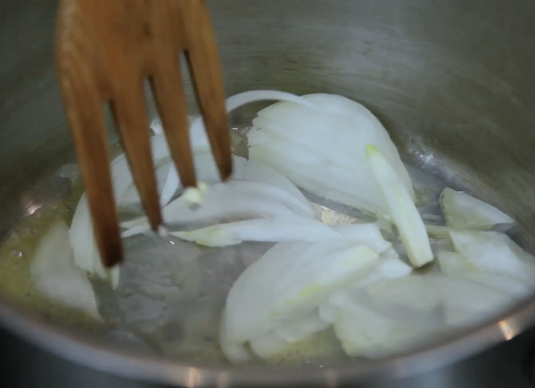 Растопить масло в кастрюле и обжарить лук в течение 5 минут.