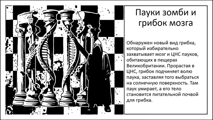 В Ирландии обнаружен новый зомби-патоген. Этот грибок заражает пещерных пауков, врастает в их нервную систему и меняет их поведение, чтобы распространять споры на новых жертв.
