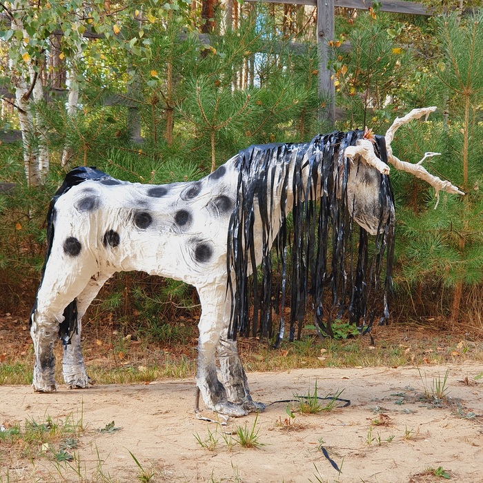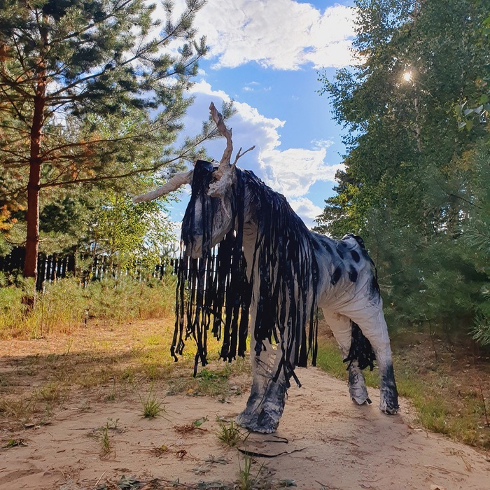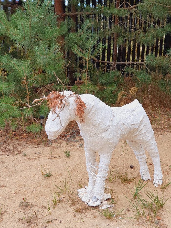 После заливки гипсом она была просто белой лошадью с рогами из сосновых веток
