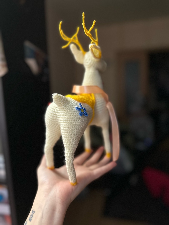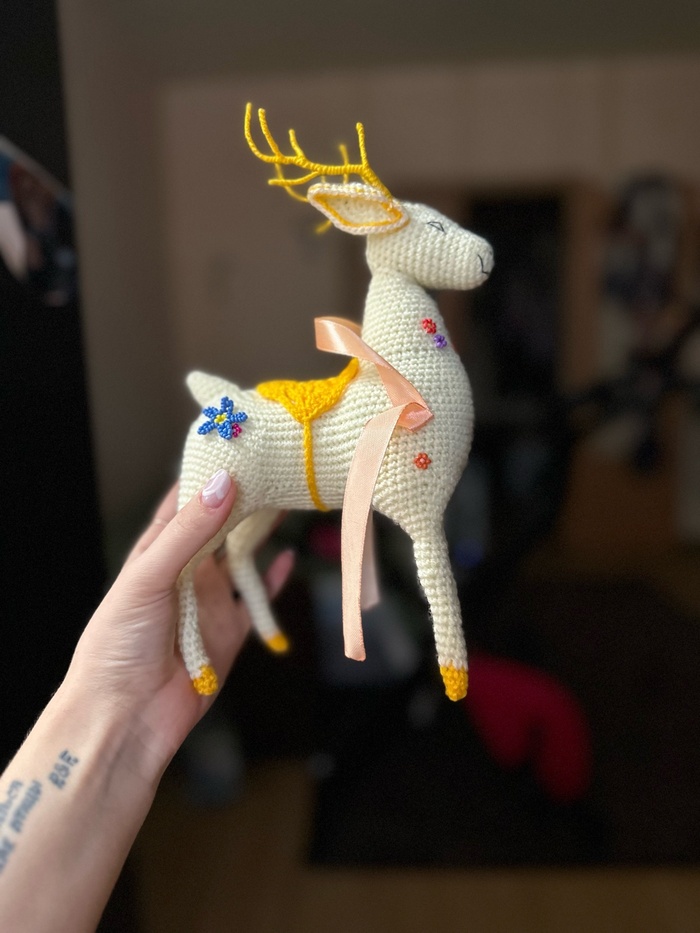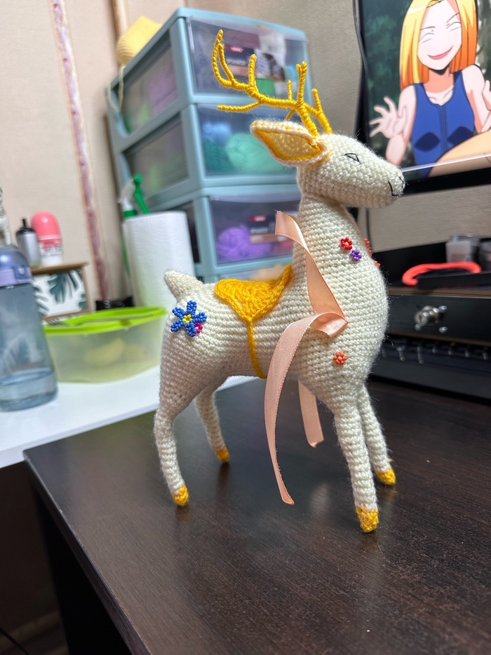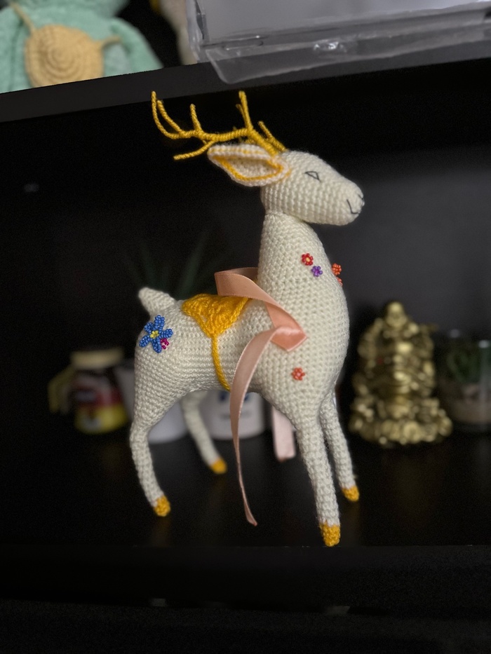 Вот такой интересный Олень мне попался на просторах интерната. И я решила его связать. Да, есть косяки. Но не считаю их критичными. Проблематично было сделать рога. Сложно было их правильно и ровно обвязать нитью. С уверенностью могу сказать что это не игрушка, а скорее декор. Так как в теле проволока, как и в рогах, и цветы созданы из бисера.