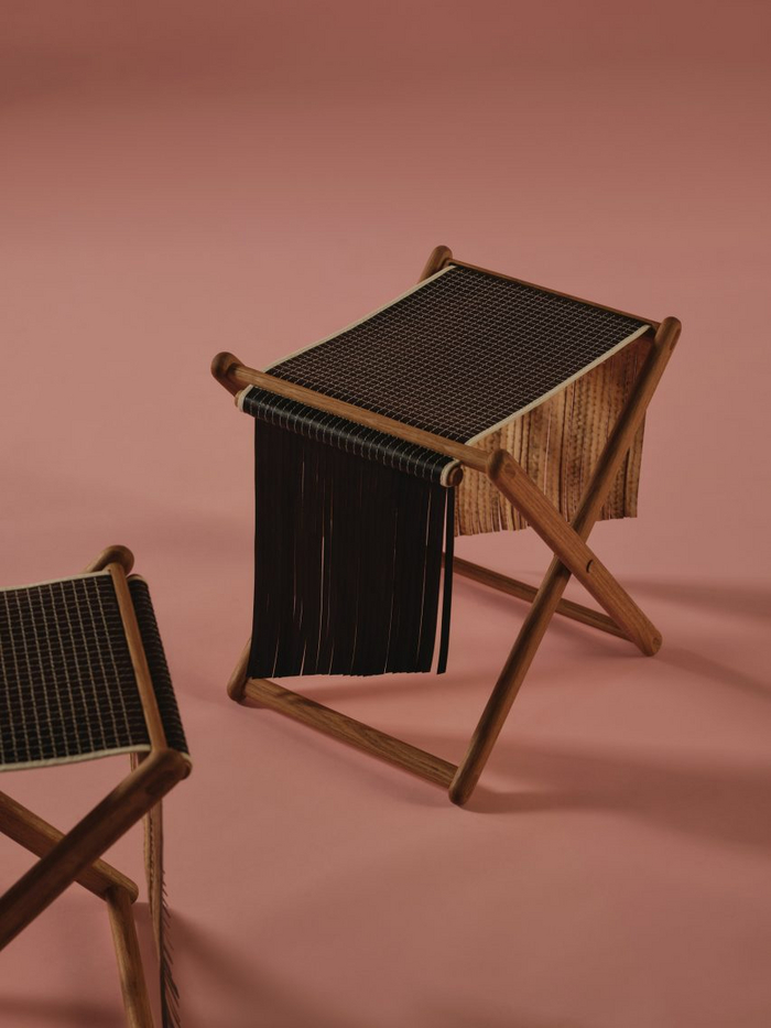Табурет Aspen от дизайнера Марион Мейлендер основан на классическом складном рыбацком табурете с современной изюминкой, которую придает сиденье из рейши, вырезанное лазером для создания декоративной бахромы.