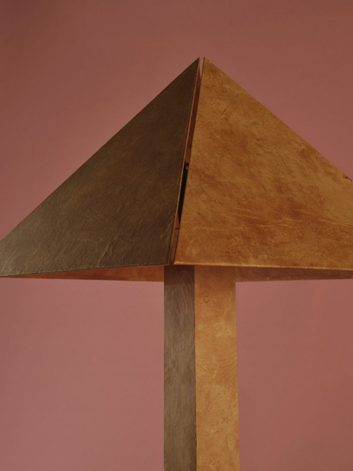 Лампа Lampadaire Silencieux дизайнера интерьеров Жосфефины Фосси подчеркивает опалесценцию рейши и его способность излучать теплый рассеянный свет. Геометрические формы основания и абажура контрастируют с естественной тактильностью материала.