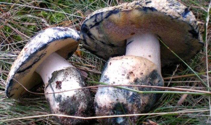 Гиропорус синеющий (синяк) — редкий гриб с беловатой или буровато-желтоватой, выпуклой шляпкой. Желтовато-белая ножка при надавливании и на разломе быстро синеет. Растет на песчаных почвах в лесах, различных по составу древесных пород, в Европейской части России, Западной Сибири, на Дальнем Востоке.