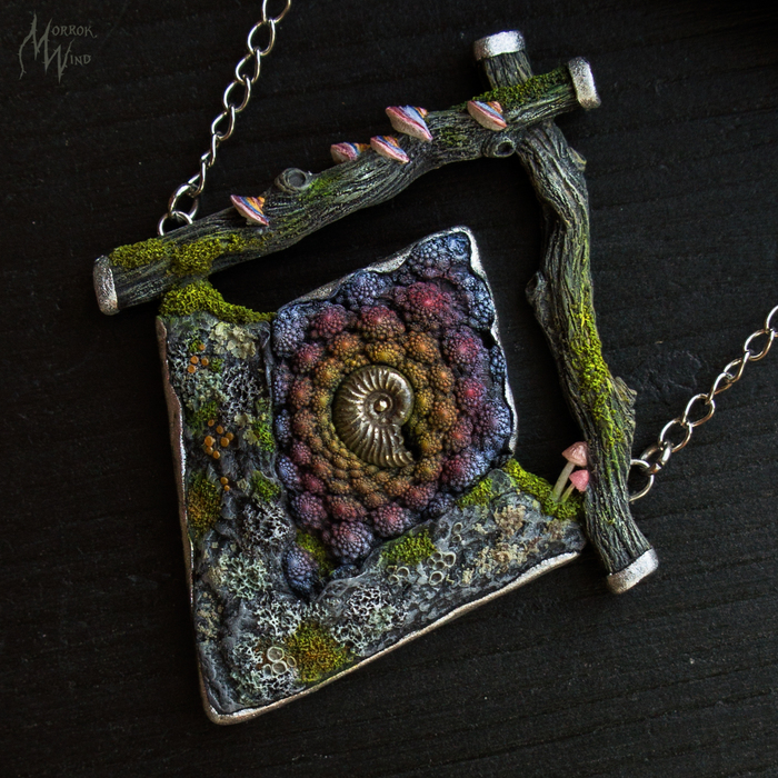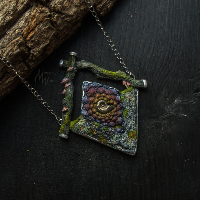 Продолжая дорогую моему сердцу тему природных текстур, поросших лишайниками камней, мшистых ветвей..... Вставка - пиритизированный аммонит. Всего каких-то 115 миллионов лет назад ( плюс-минус пяток миллионов), во время ранноего Мела, он был живой улиточкой, плавал себе в водах древнего океана и в ус не дул ( но это не точно, может и дул). Интересно, что будет с ним дальше, хотя бы через жалкие 100-200 лет. А пока этот миг в его долгом пути он побудет вставкой в моем украшении.