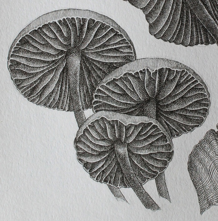 Почему грибы? Интересно их строение, и как его можно показать таким дотошным образом (ну ладно, еще была пройдена накануне вторая часть The Last of Us, навеяло, признаю). К слову, референс из интернета, немного поменяла местами грибы и их количество для удобства.