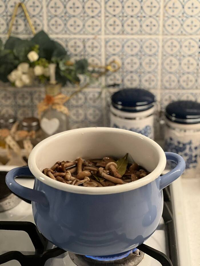Закидываем подготовленные грибы в кастрюлю, заливаем водой, доводим до кипения