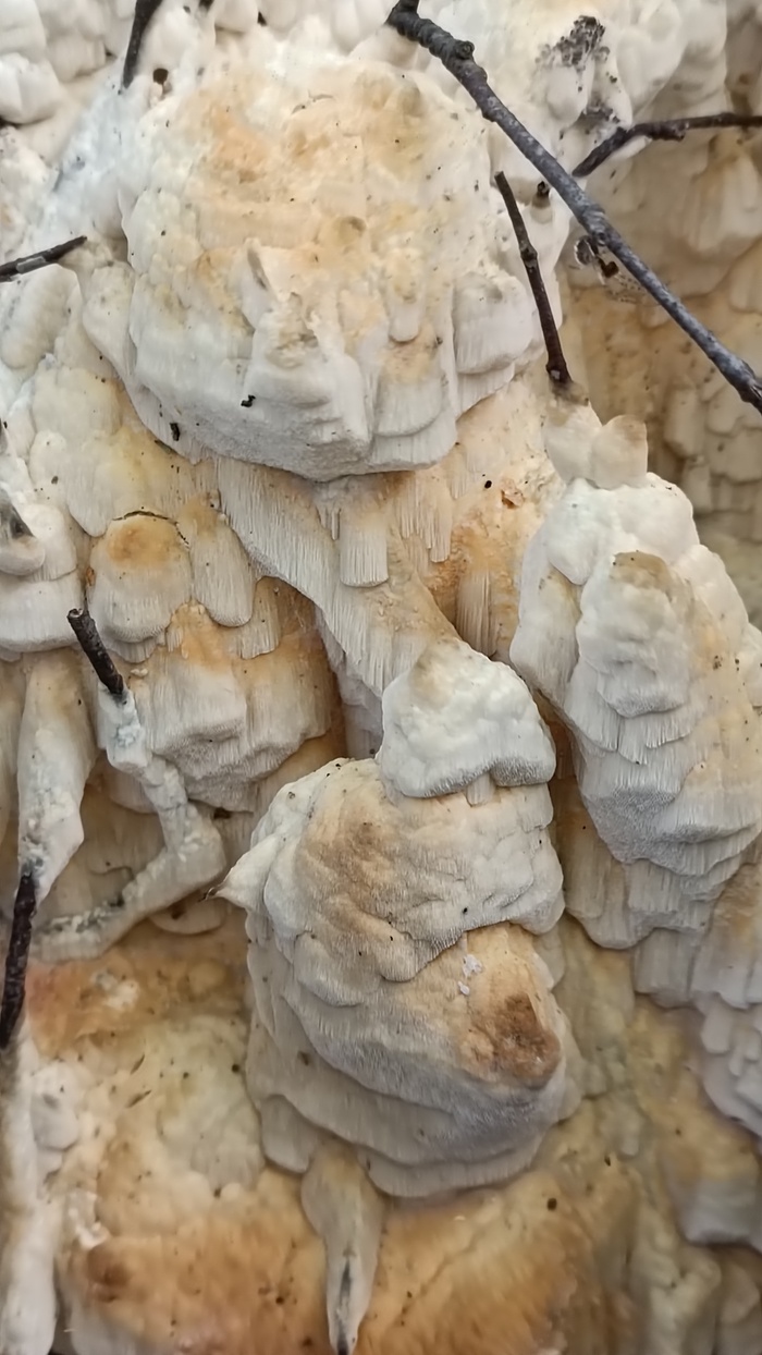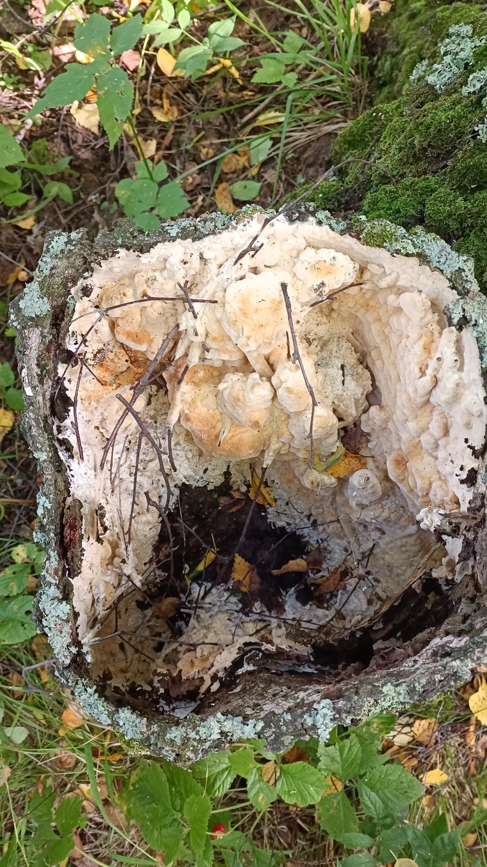 Промт: A tree stump deep in the forest, covered in moss and ringed with various mushrooms. Ferns grow nearby, and the bark texture is rough and weathered. Detailed close-up, earthy tones, morning light.