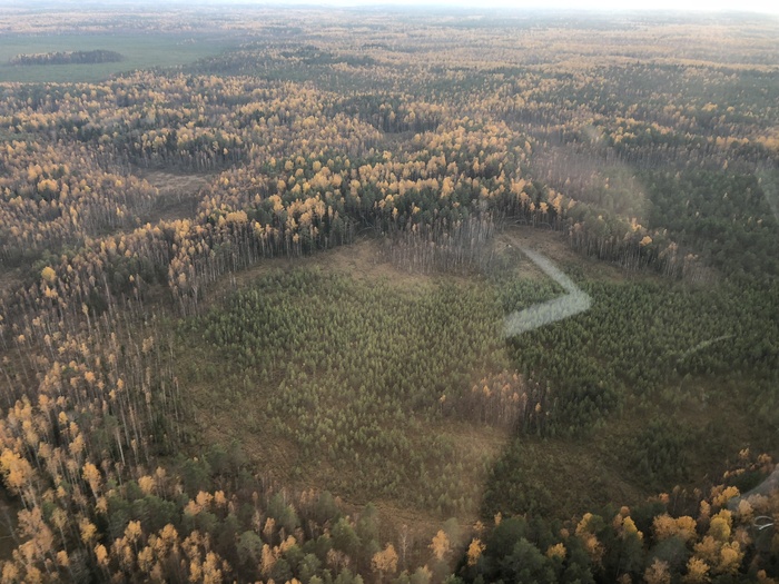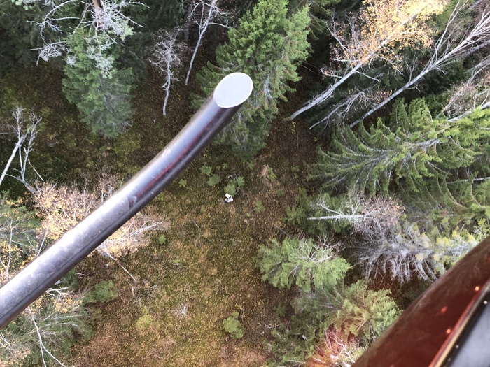 Осматриваем вырубку с востока, до пострадавшего 400 метров. Но сесть негде. Лес вырубили, но стволы и пни никуда не делись. Просто негде пристроить лыжи совершенно. Заходим с юга. Вроде сверху площадка ровная и до пострадавшего метров 300, но снизившись мы понимаем, что сесть скорее всего и здесь не получится. Под нами болото. Две попытки показали, что сесть не удастся. Ничего не остается, кроме как уходить. Есть подходящая поляна, но она ровно за тем болотом с открытой водой. Форсировать его пешком не получится. Уходим. Извините, ребята, придется вам самим доставать пострадавшего. Все что могли, мы сделали. Координаты вместе с указанием взять как можно больше воды и вызвать бригаду медиков, так как у пострадавшего кровотечение, переданы спасателям ПСО-8 и группе эвакуации «Лиза Алерт», которые выдвинулись на место.