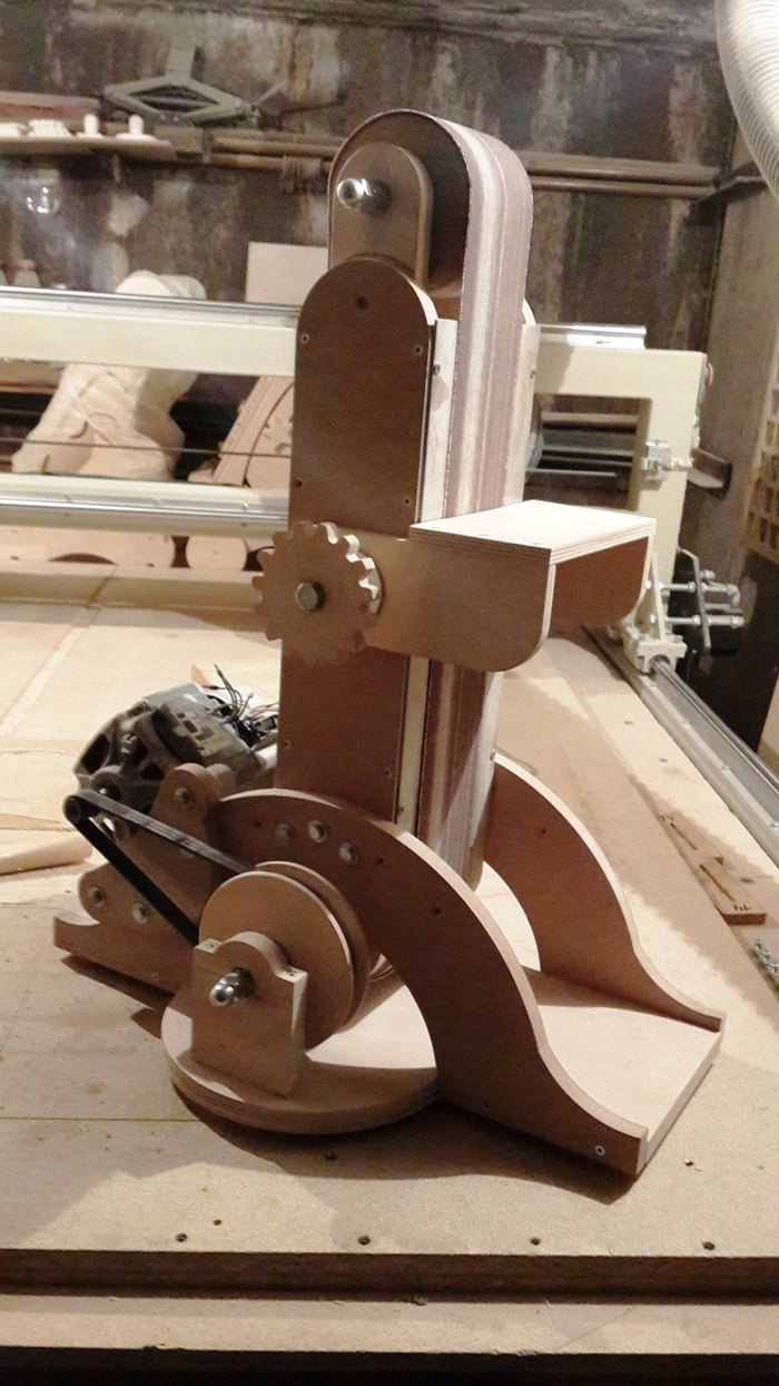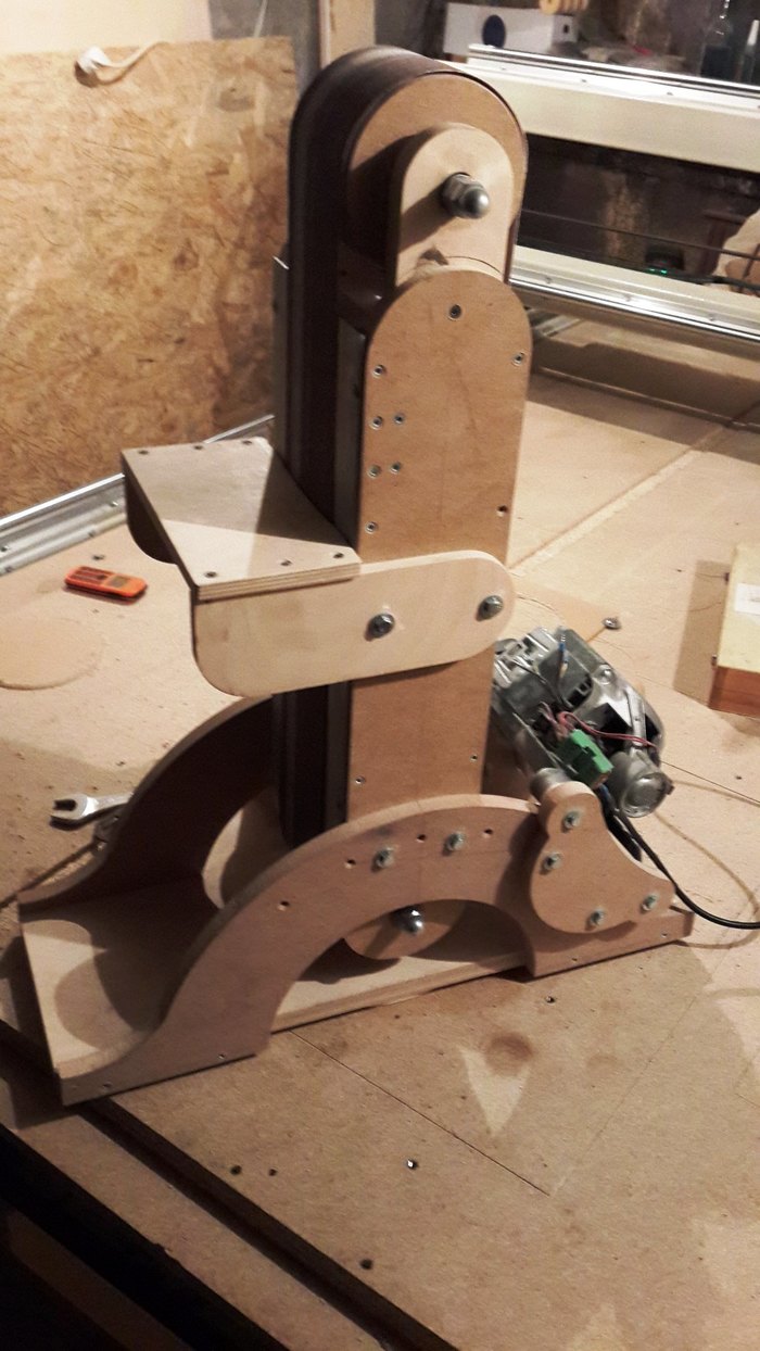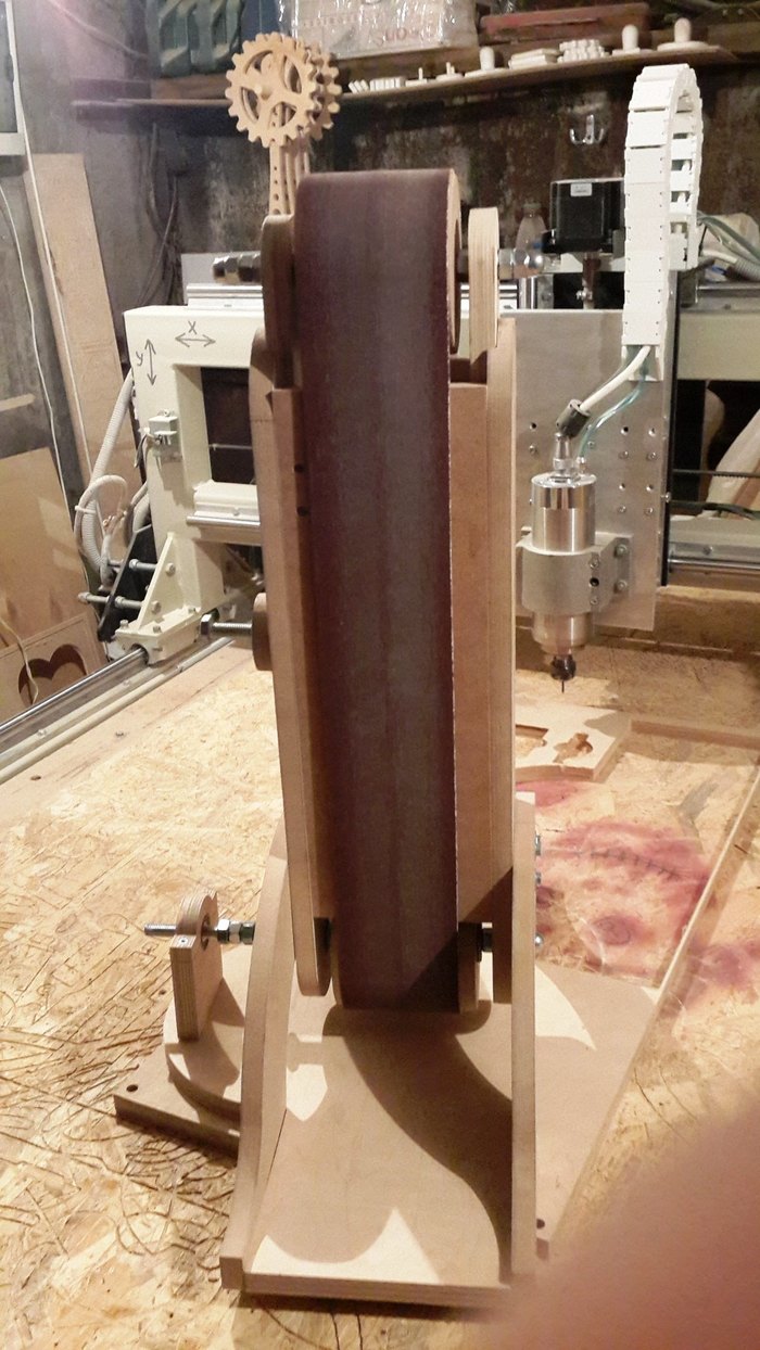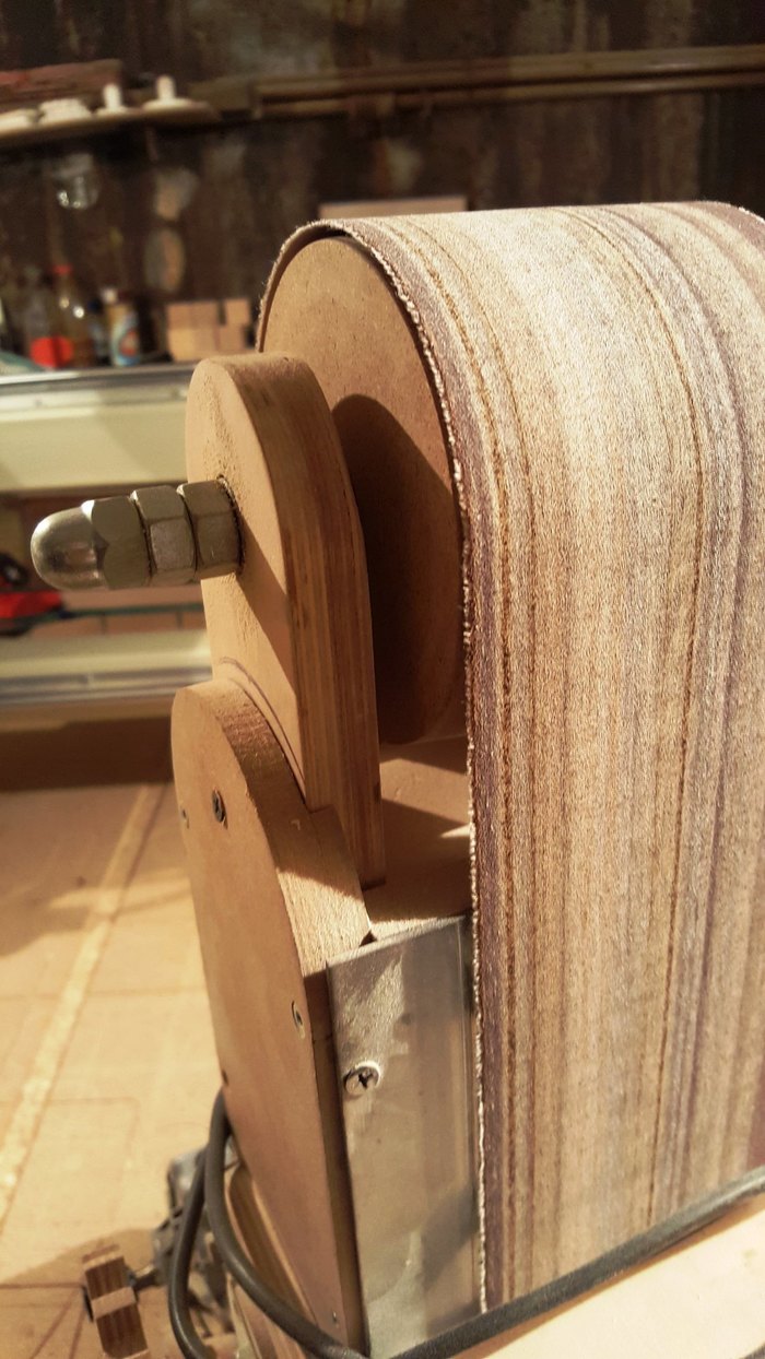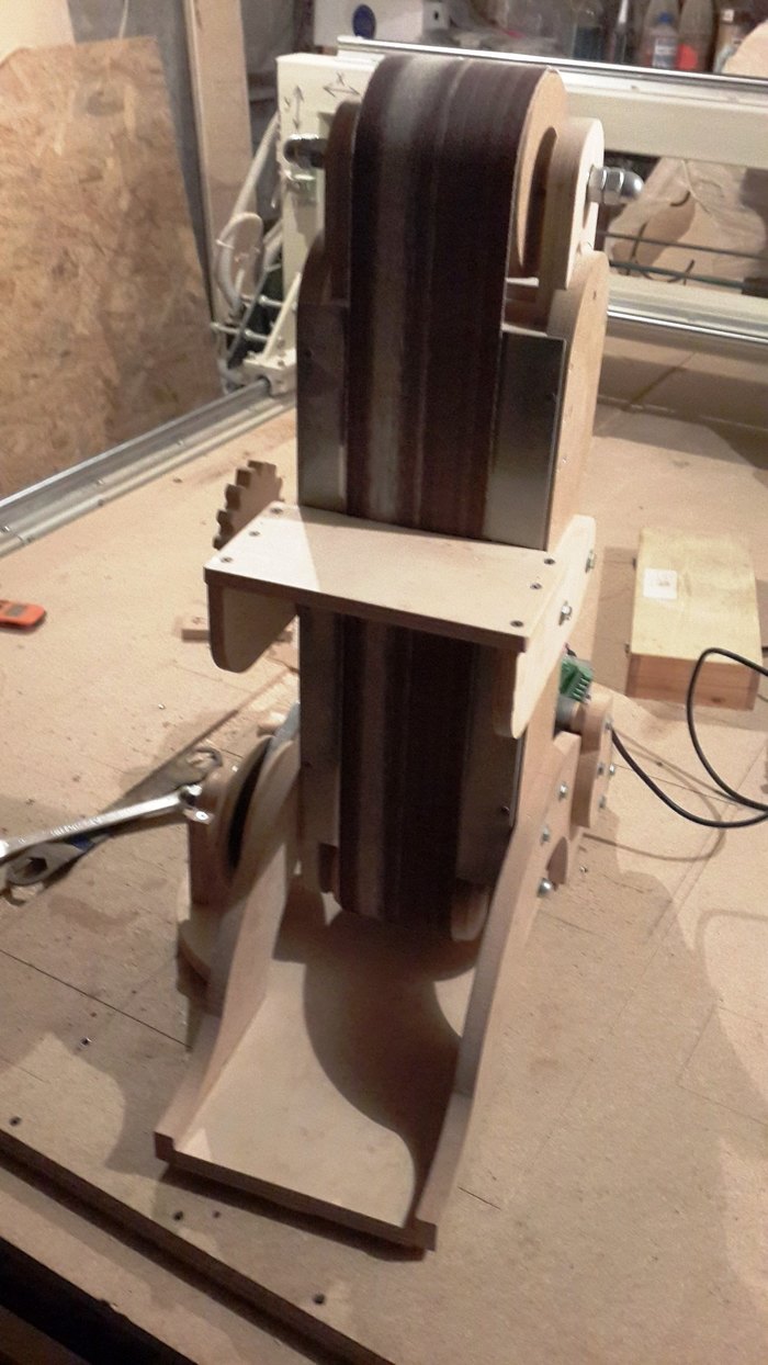 Несколько фотографий собранного ленточного шлифовального станка Affe без установленной ленты и без УШМ, а также с установленной УШМ и лентой. Как видно, габариты совсем скромные и позволяют без проблем размещать такой станок на рабочем верстаке в мастерской или в гараже. А использование беспроводной УШМ позволяет работать и без сетевого питания.